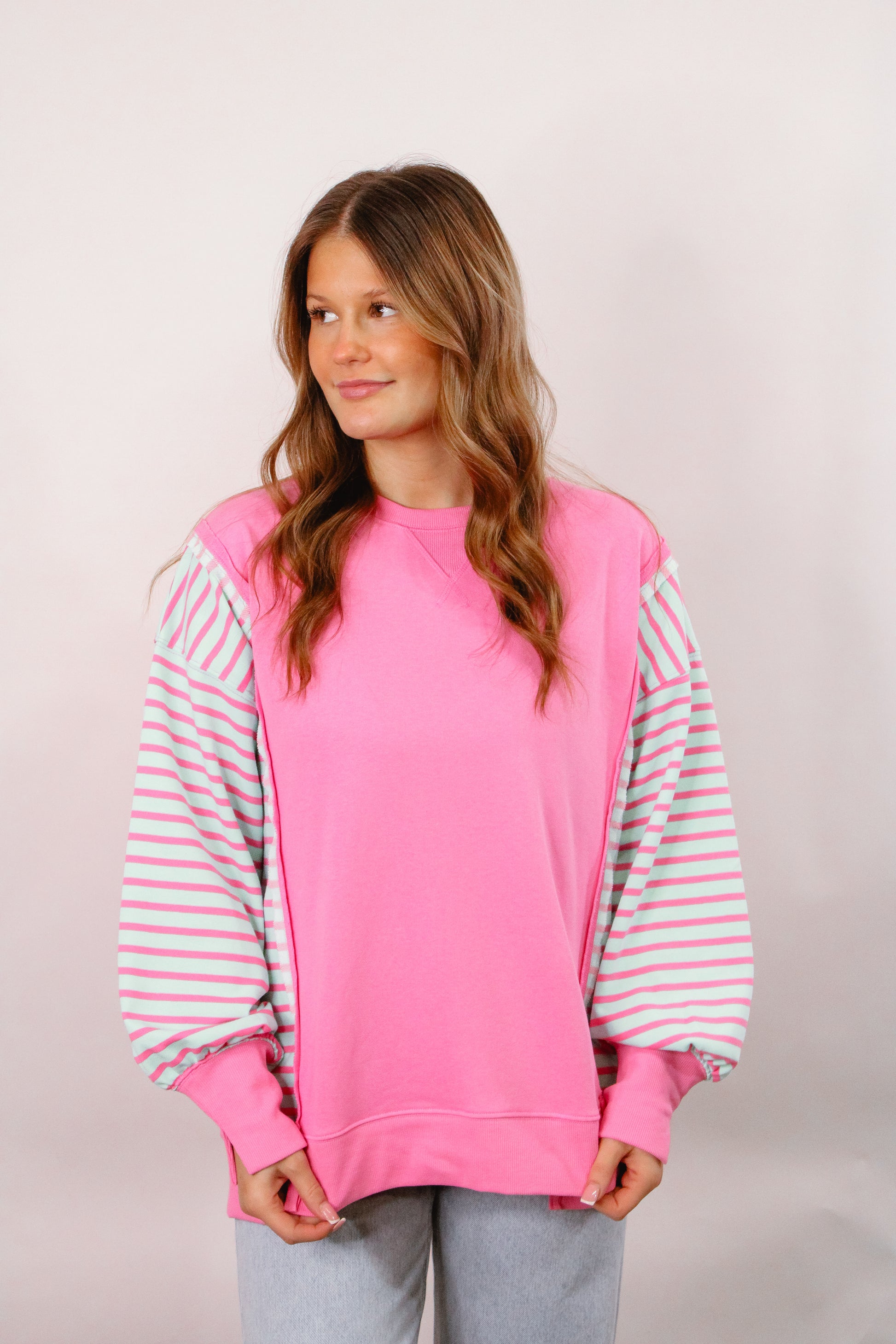 Add a fun pop of color to your cozy days with our Bubblegum Stripe Sleeve Sweatshirt! This adorable top mixes a bright pink body with playful mint-and-pink striped sleeves for the sweetest contrast. The oversized fit, soft knit fabric, and relaxed silhouette make it perfect for leggings, jeans, or a comfy day out running errands.