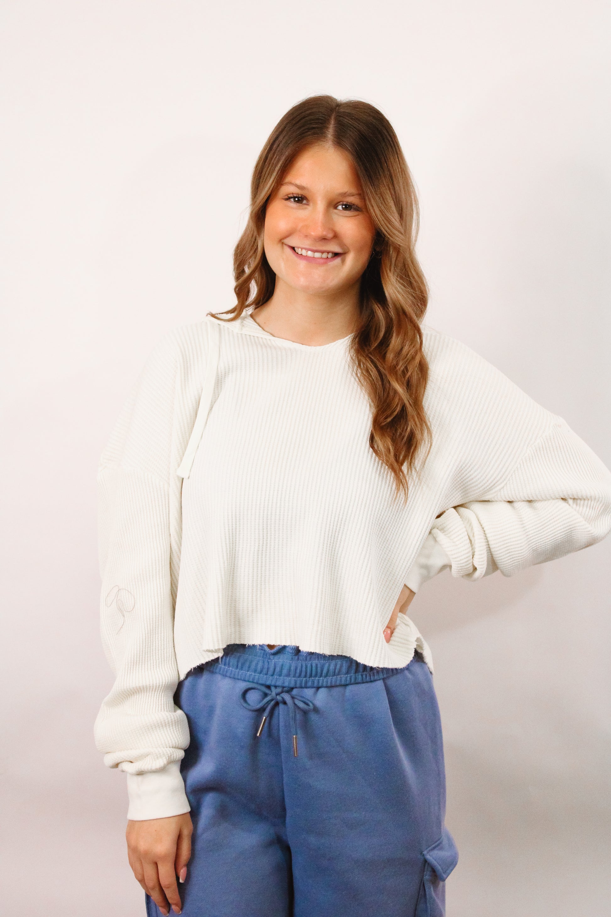 The everyday lightweight hoodie you’ll reach for constantly. Soft ribbed fabric, a relaxed slouchy fit, and drawstrings keep it effortless and comfy. Toss it on with joggers, denim, or leggings for that clean-girl cozy vibe.