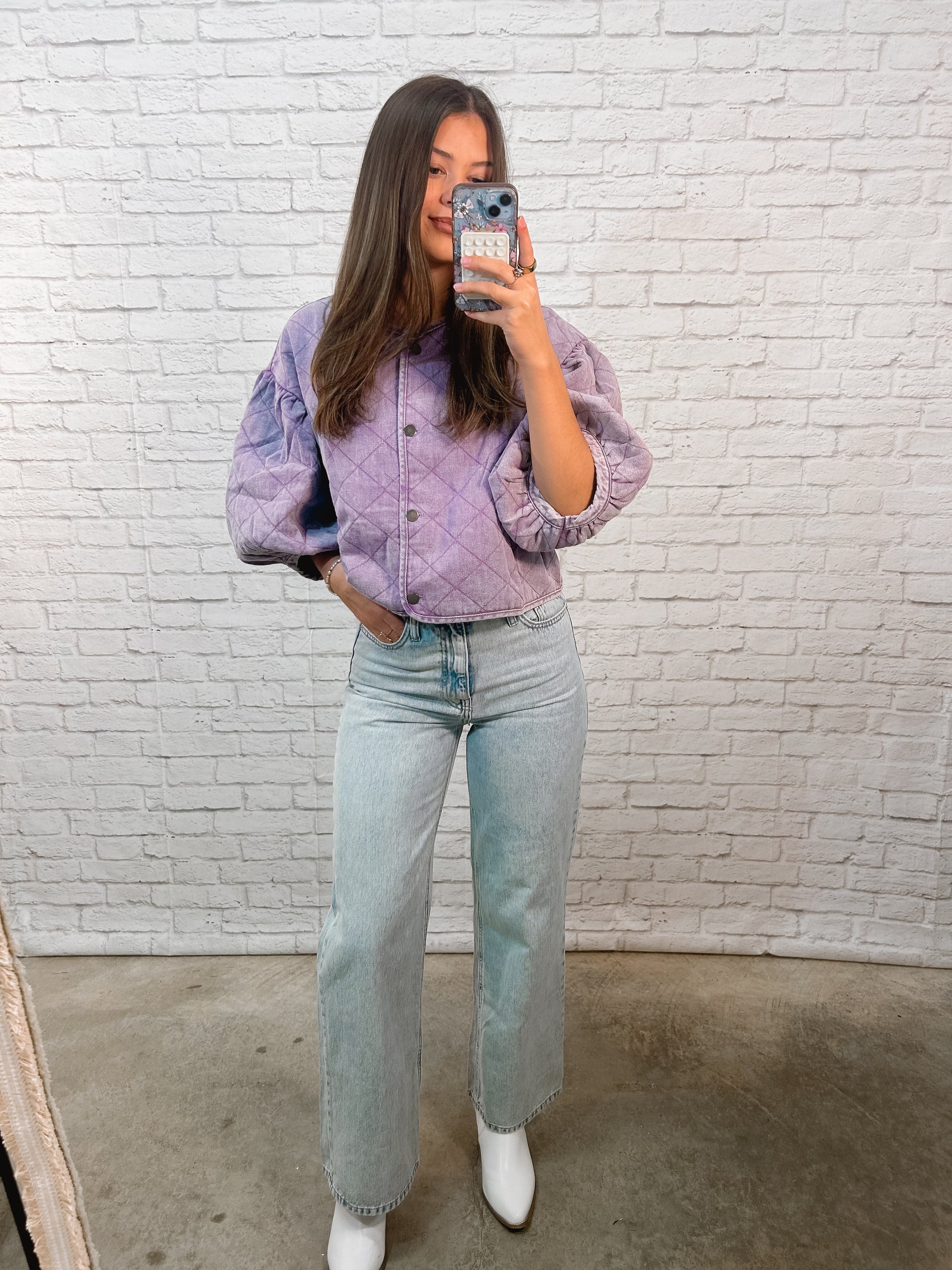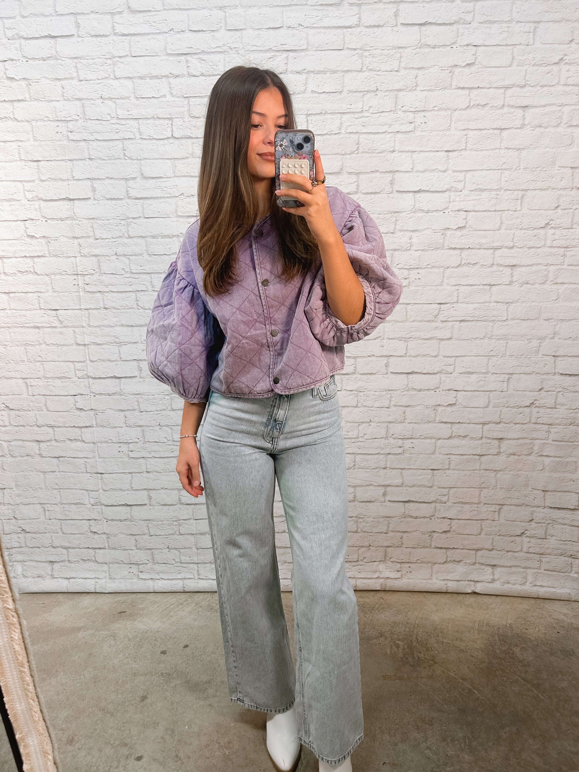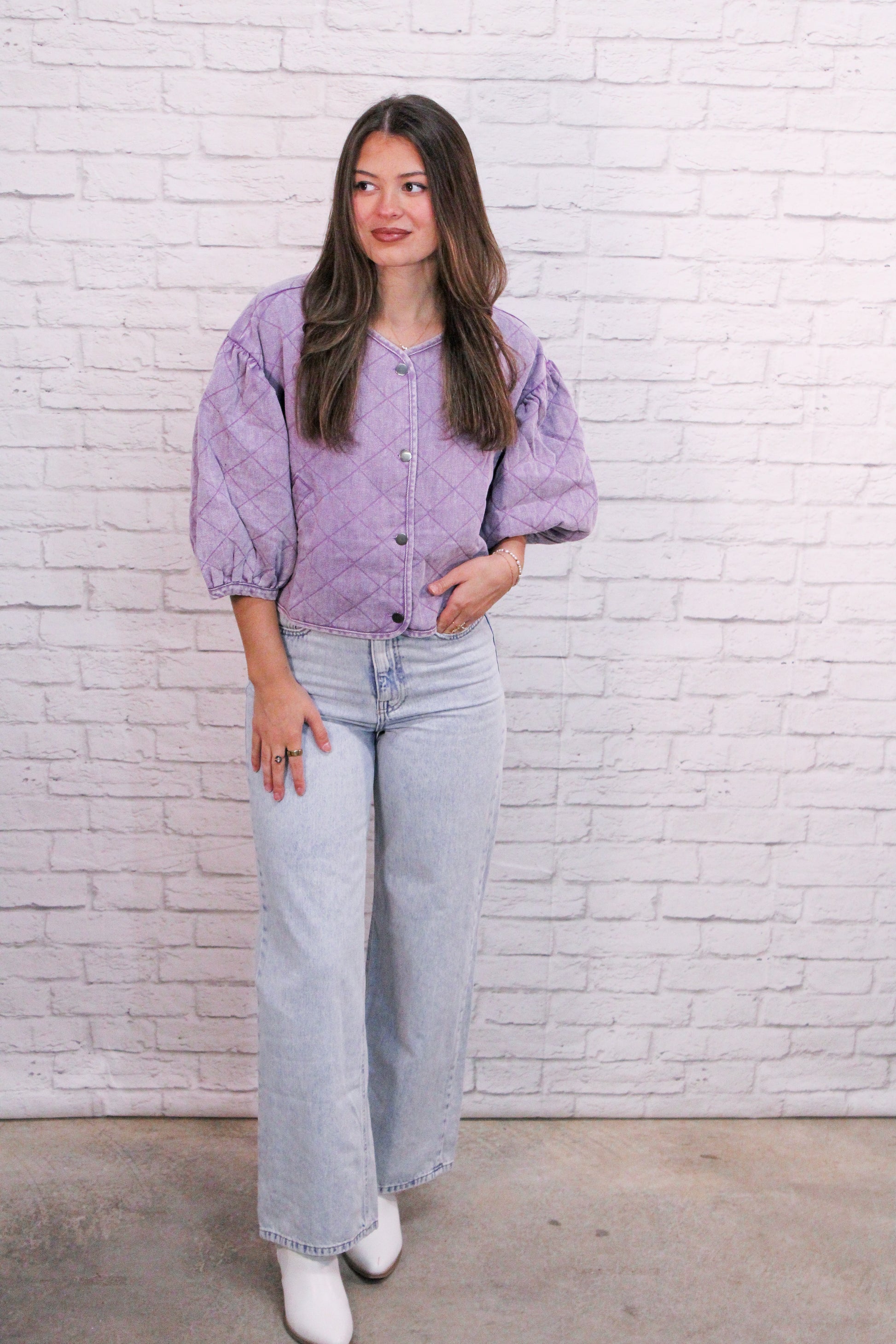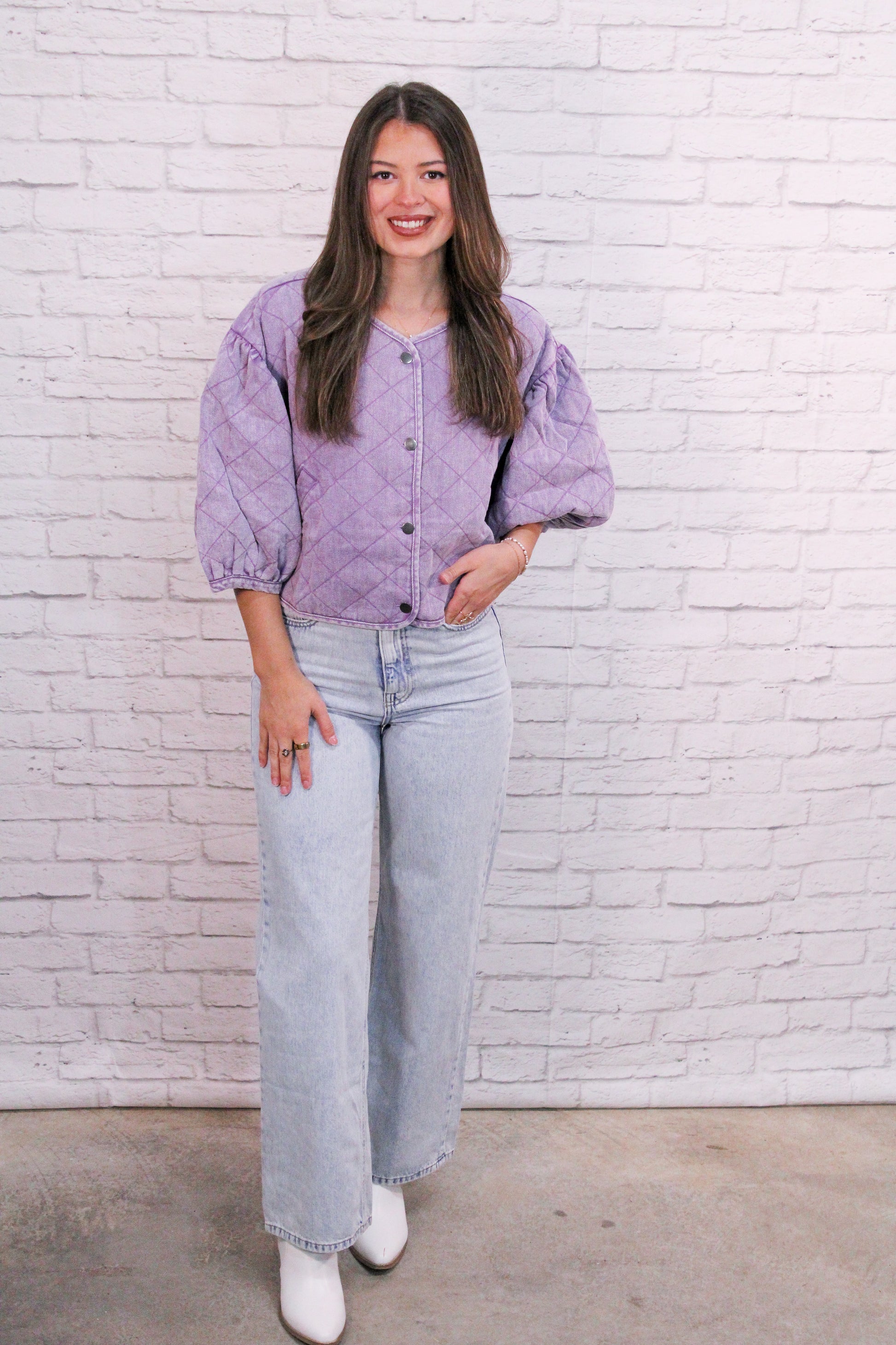Top features a soft quilted texture with puff sleeves and a relaxed fit that's perfect for transitional weather. Lightweight yet cozy, this top is ideal for layering or wearing on its own.