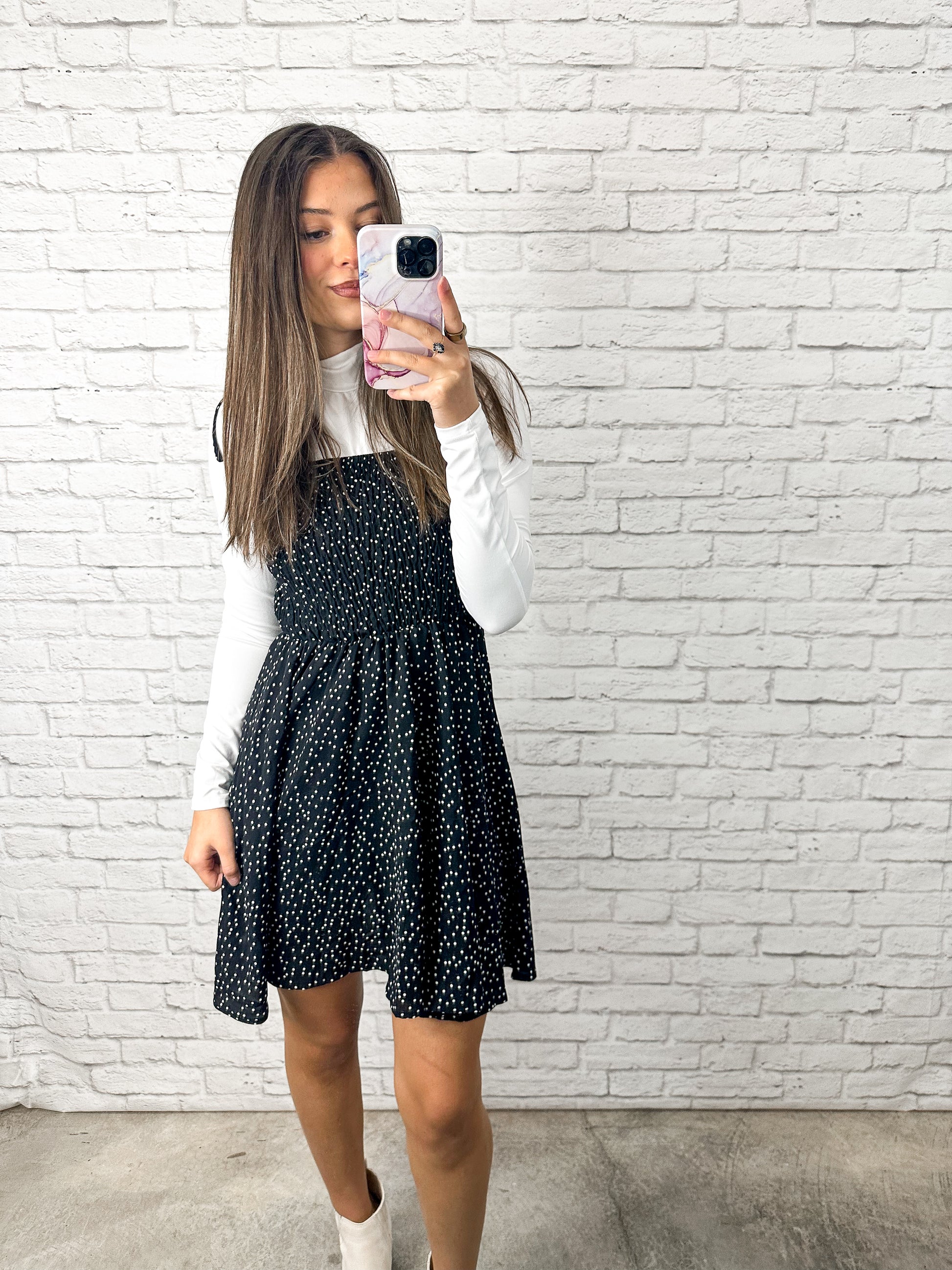 Meet the Midnight Daydream Sundress — your new throw-on-and-go favorite. This black sundress features a subtle white dotted print, a comfy elastic waist, and a flowy skirt that moves beautifully with you. Lightweight and breezy, it layers perfectly with a long sleeve or denim jacket now and wears solo when warmer weather hits.