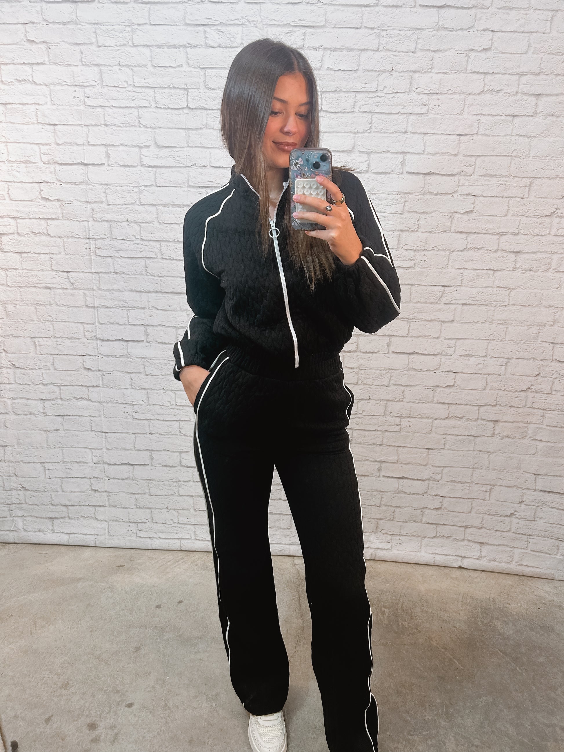 Sleek, sporty, and effortlessly cool — this black quilted set is made for days when comfort meets confidence. Featuring a zip-front long sleeve top with crisp white piping and matching quilted joggers, this set gives an elevated athleisure vibe you’ll reach for on repeat. The textured quilted fabric adds dimension while the relaxed fit keeps it comfy and flattering.