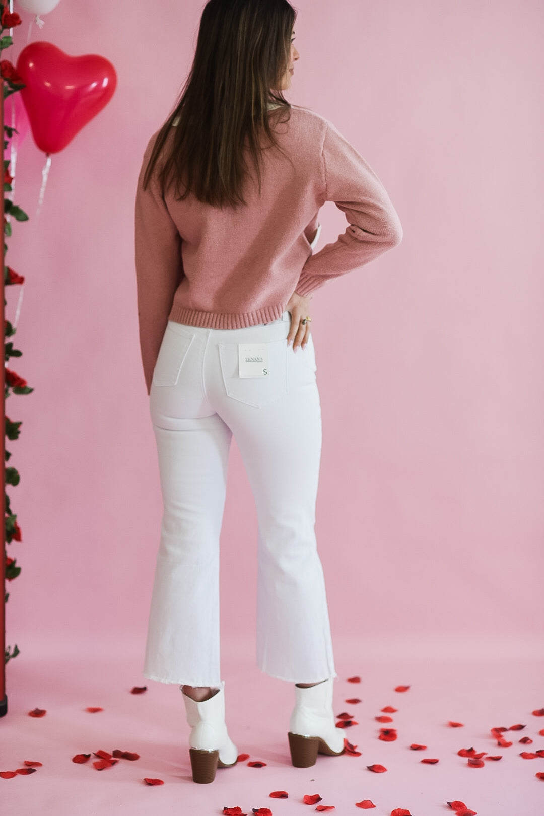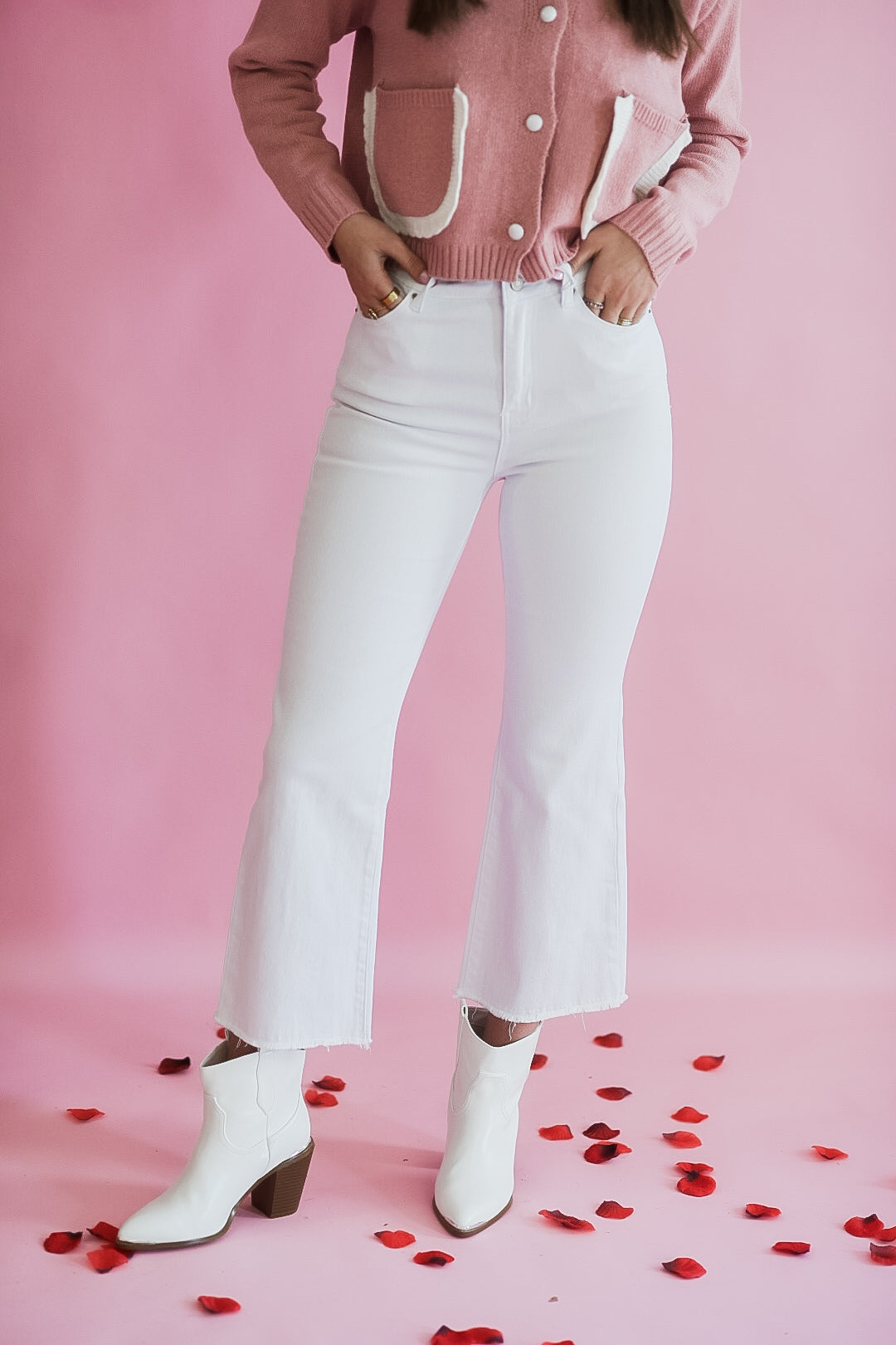 Upgrade your wardrobe with our No Shame Jeans. These crop flares come in a stylish white color and are made with a stretchy fabric, providing both comfort and fashion. Perfect for any occasion, these jeans are the ultimate addition to your closet. Maddy is 5’9 wearing small.