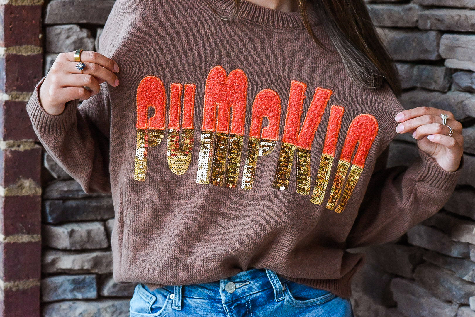 Add a little sparkle to sweater season with our Pumpkin Spice Sequin Sweater! Featuring bold embroidered lettering and gold sequin detailing across the front, this cozy mocha pullover brings fun fall energy to any outfit.