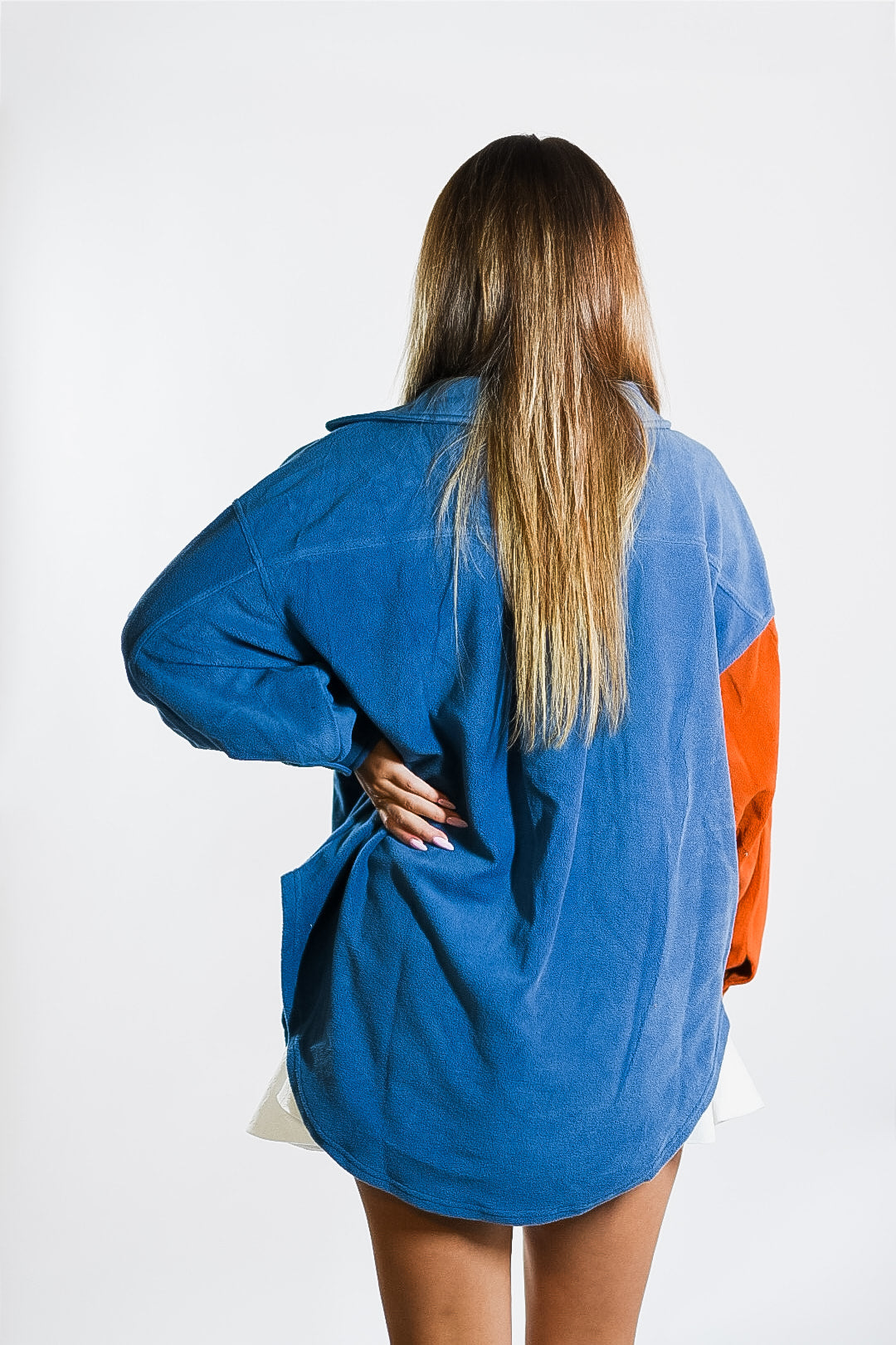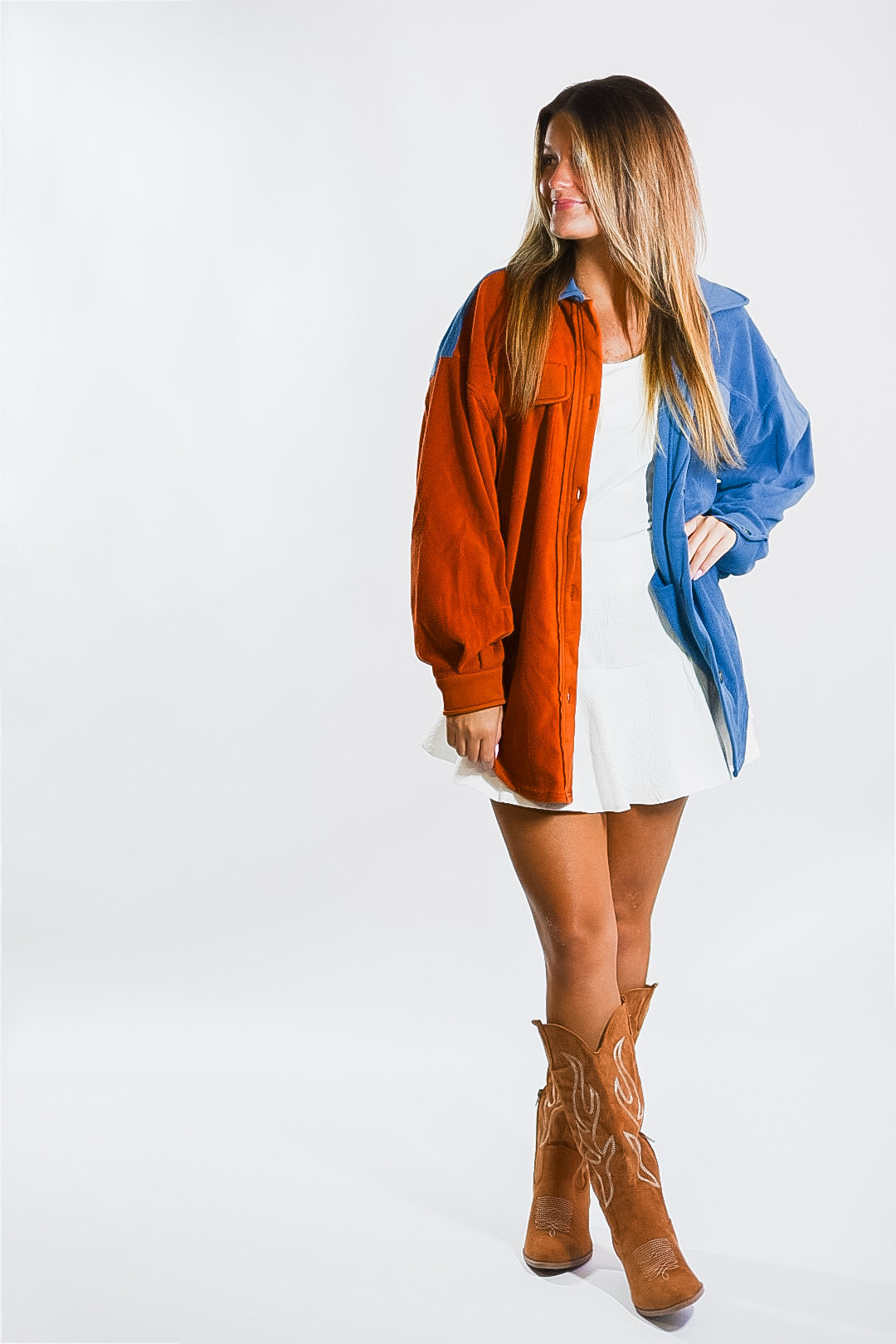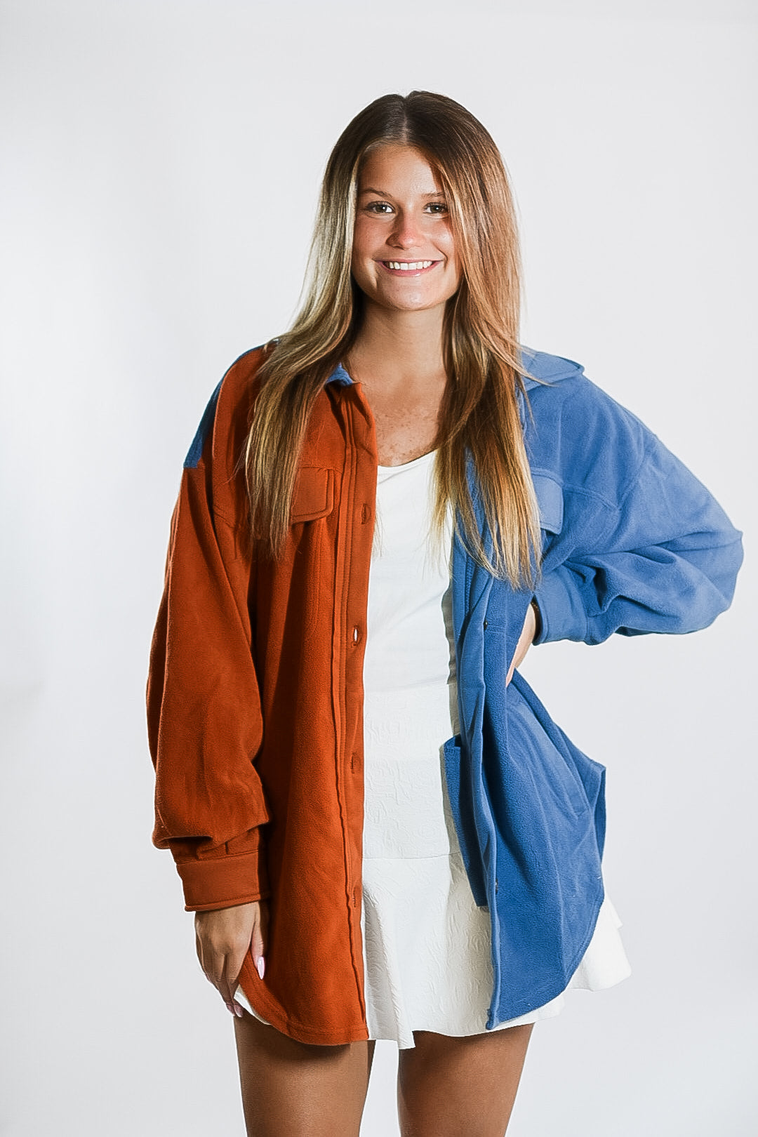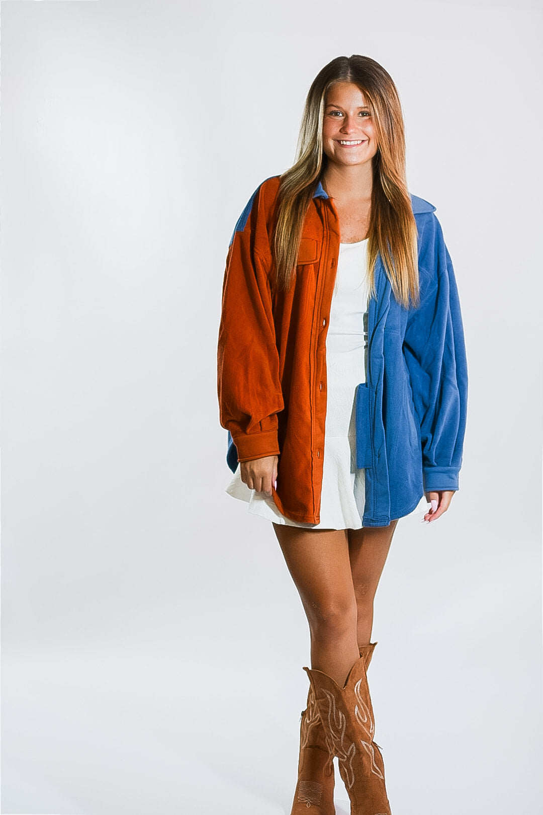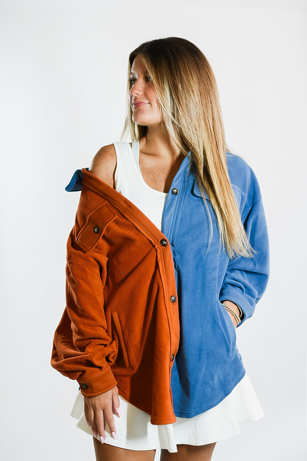Elevate your style with our Split In Two Top! This cardigan/jacket features a trendy color block design with split colors in rust and blue, adding a pop of personality to your outfit. The button-down detail adds a touch of sophistication, making it a versatile piece for any occasion. Add this unique top to your wardrobe today and stand out in style! Hannah is 5’5 wearing small.