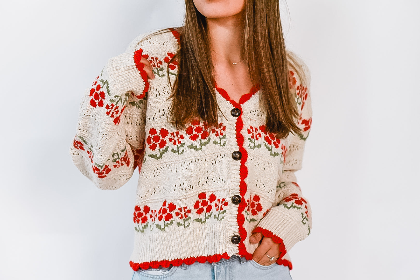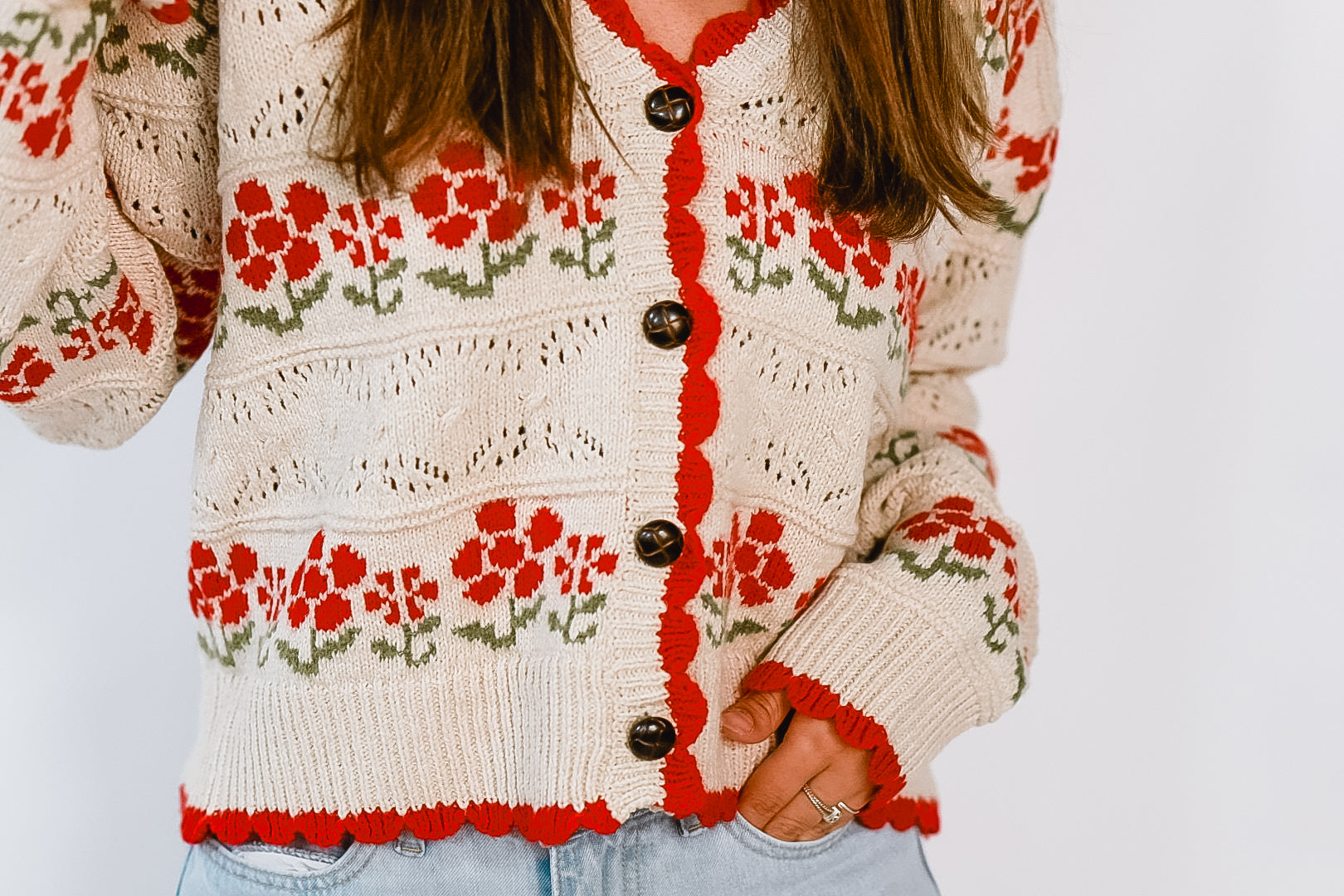 Bloom into cozy charm with our Sweet Poppy Knit Cardigan! This cream knit beauty features rows of cheerful red floral patterns with soft green stems, giving it a vintage-inspired feel that’s both timeless and playful. The scalloped red trim along the neckline, cuffs, and hem adds a pop of color and a touch of femininity, while the button-down front makes it easy to layer or wear solo.