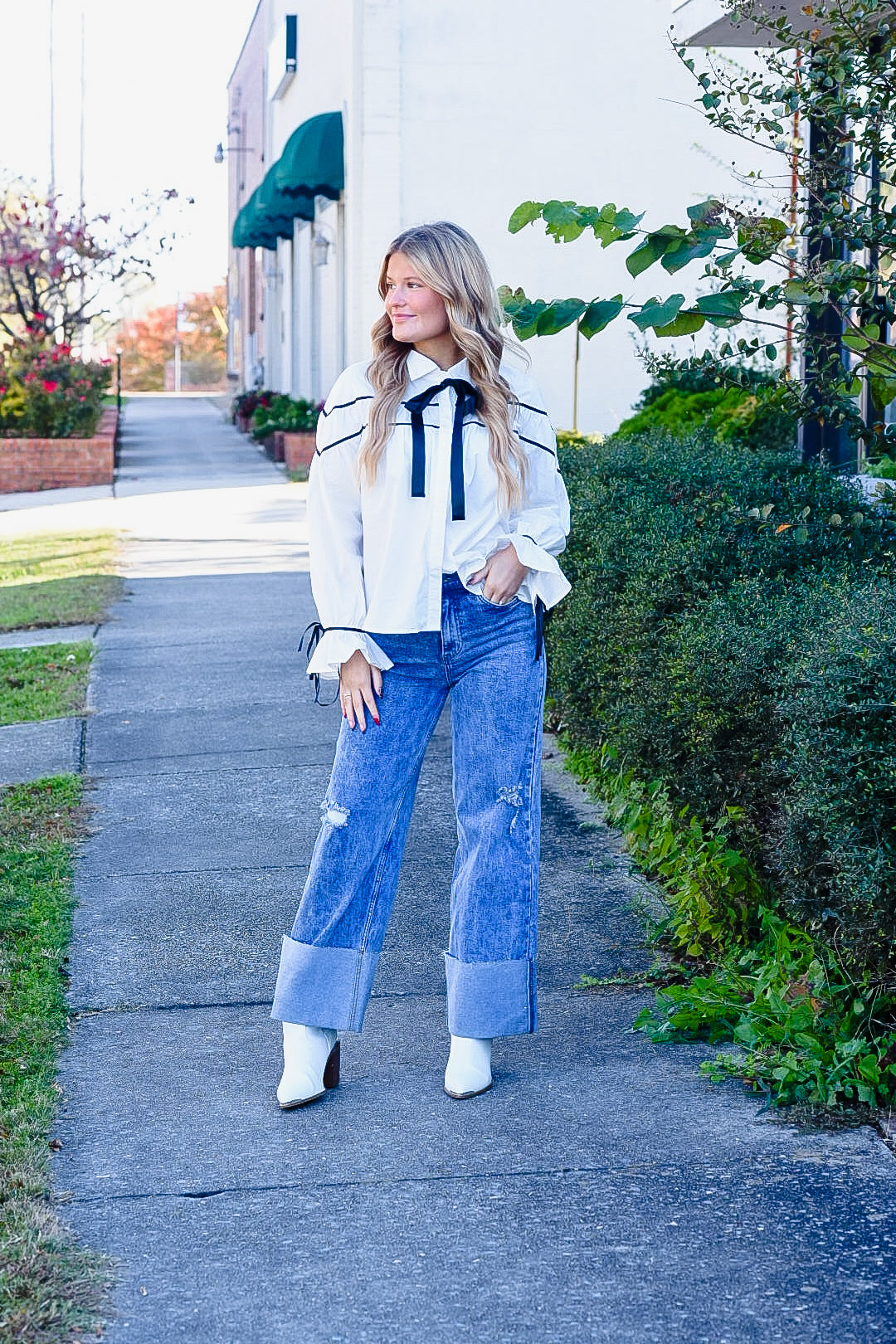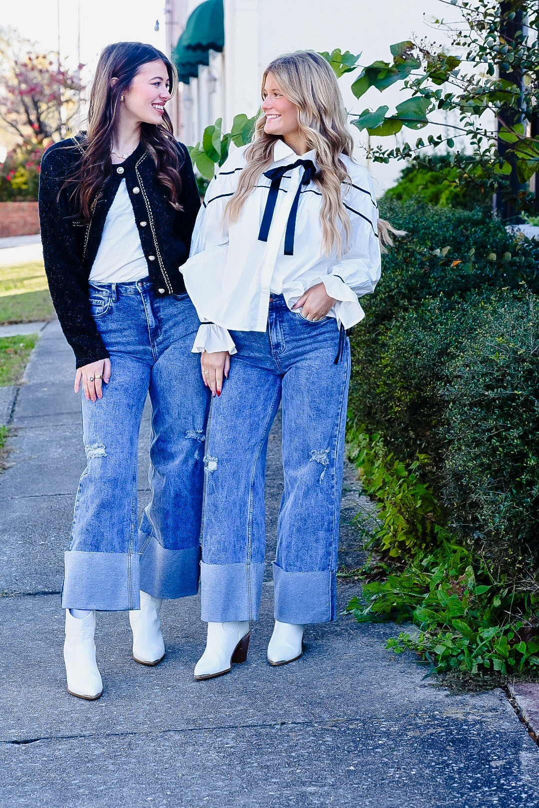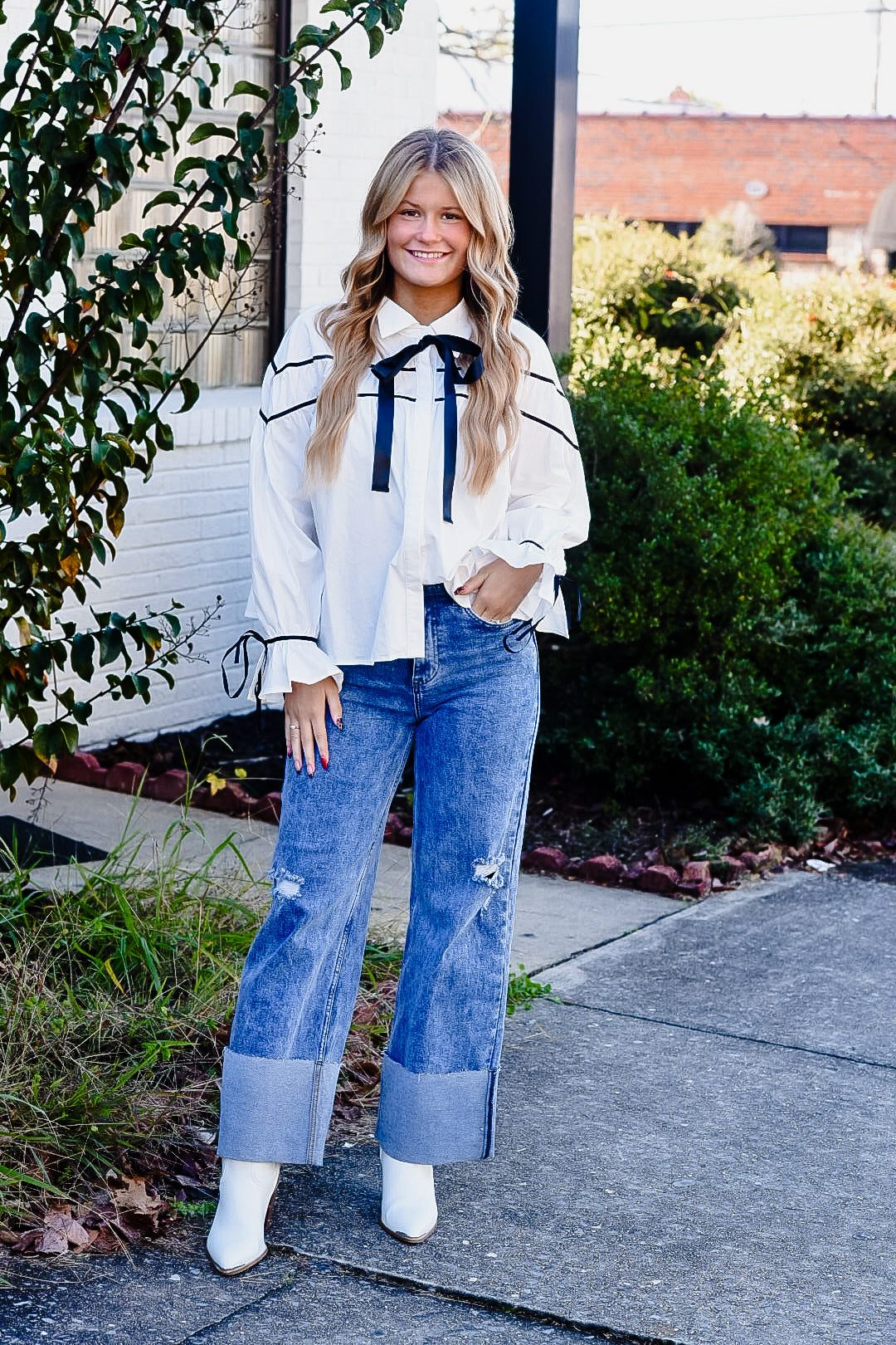 Introducing Tied Up In Ribbons - the perfect addition to your wardrobe. This cute white top features black ribbon detailing, adding a touch of elegance to any outfit. Made with quality materials for lasting wear. Step up your style game with Tied Up In Ribbons. Hannah is 5’5 wearing small.