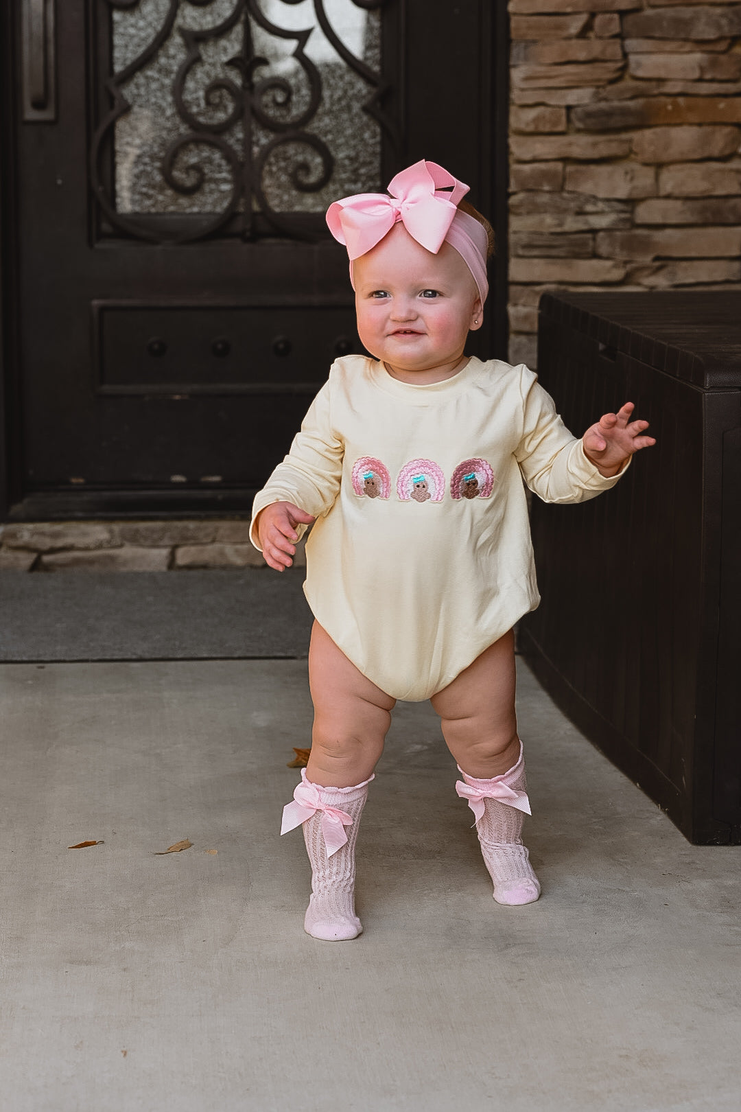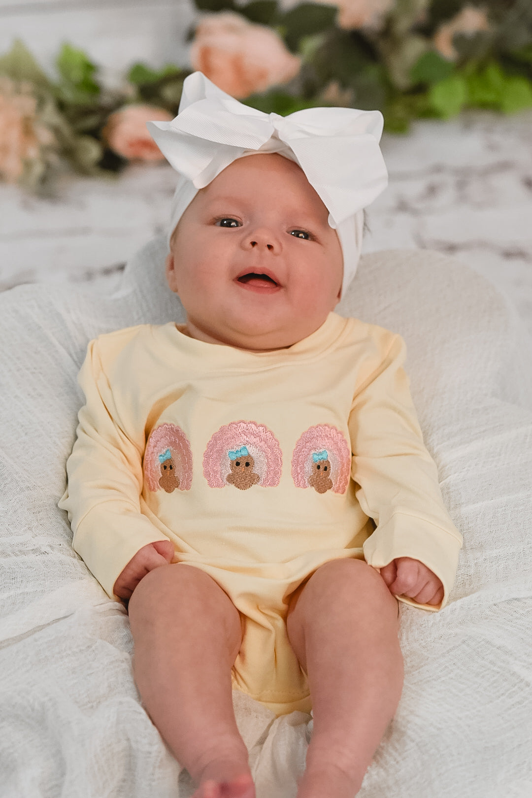 Brighten up your little one’s Thanksgiving look with this adorable yellow embroidered turkey bubble! Featuring a cheerful embroidered turkey design across the chest and soft fabric for all-day comfort, it’s the perfect outfit for fall gatherings, family photos, and holiday celebrations.